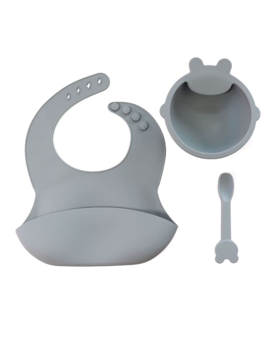 Lot de bavoir en silicone + assiette + cuillère - Gris