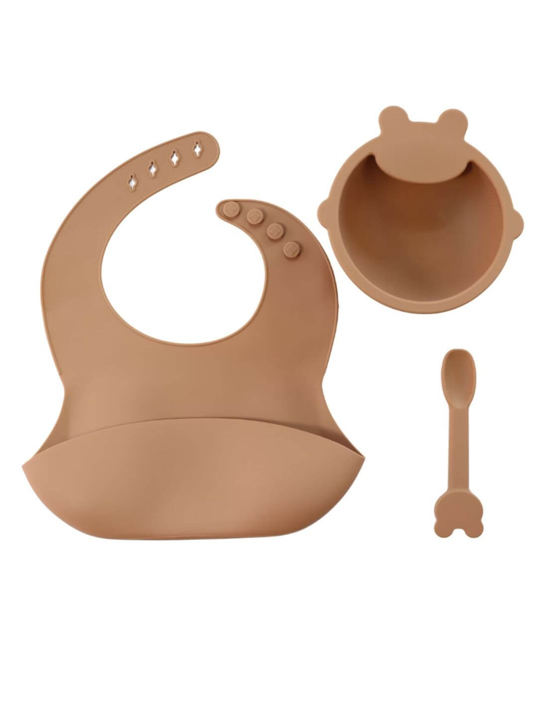 Lot de bavoir en silicone + assiette + cuillère - Marron