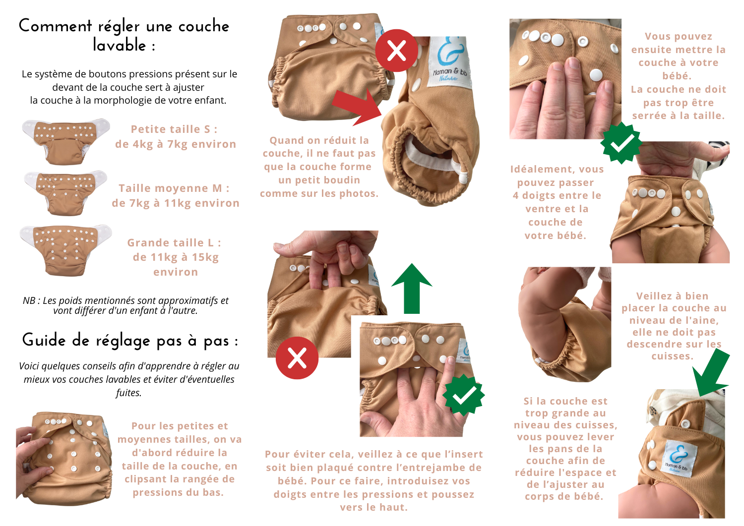 Nous avons rédigé une petite brochure pour vous aider à ajuster vos couches lavables au mieux, n'hésitez pas à la télécharger.