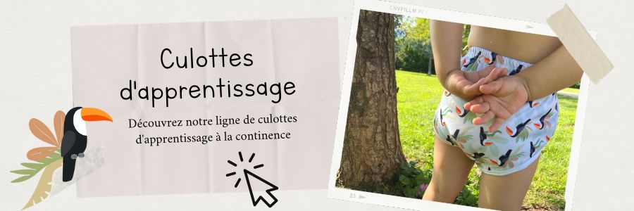 Vous avez également la possibilité de passer par une étape intermédiaire : la culotte d’apprentissage ! Elle permet aux enfants de prendre conscience qu'ils doivent aller sur le pot. Conçue pour ne retenir qu'un petit pipi, elle permet aux enfants en bas âge de sentir l'humidité sans que leurs vêtements ne soient mouillés. Vous pouvez retrouver ces culottes sur notre boutique :