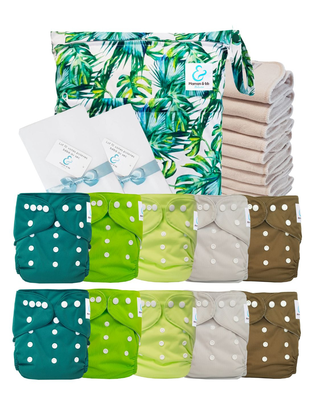 Pack Premium Sensitive : 10 couches lavables TE1 + inserts coton + voiles + sac - Bali