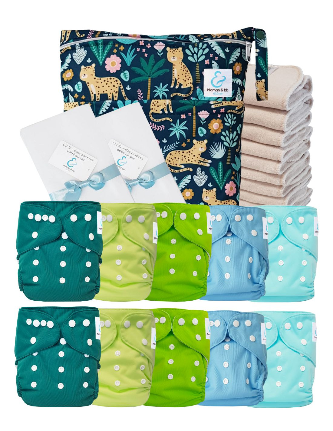 Pack Premium Sensitive : 10 couches lavables TE1 + inserts en coton + voiles + sac - Leopold