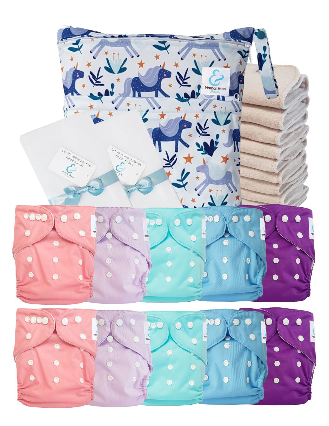Pack Premium Sensitive : 10 couches lavables TE1 + inserts en coton + voiles + sac - Licorne
