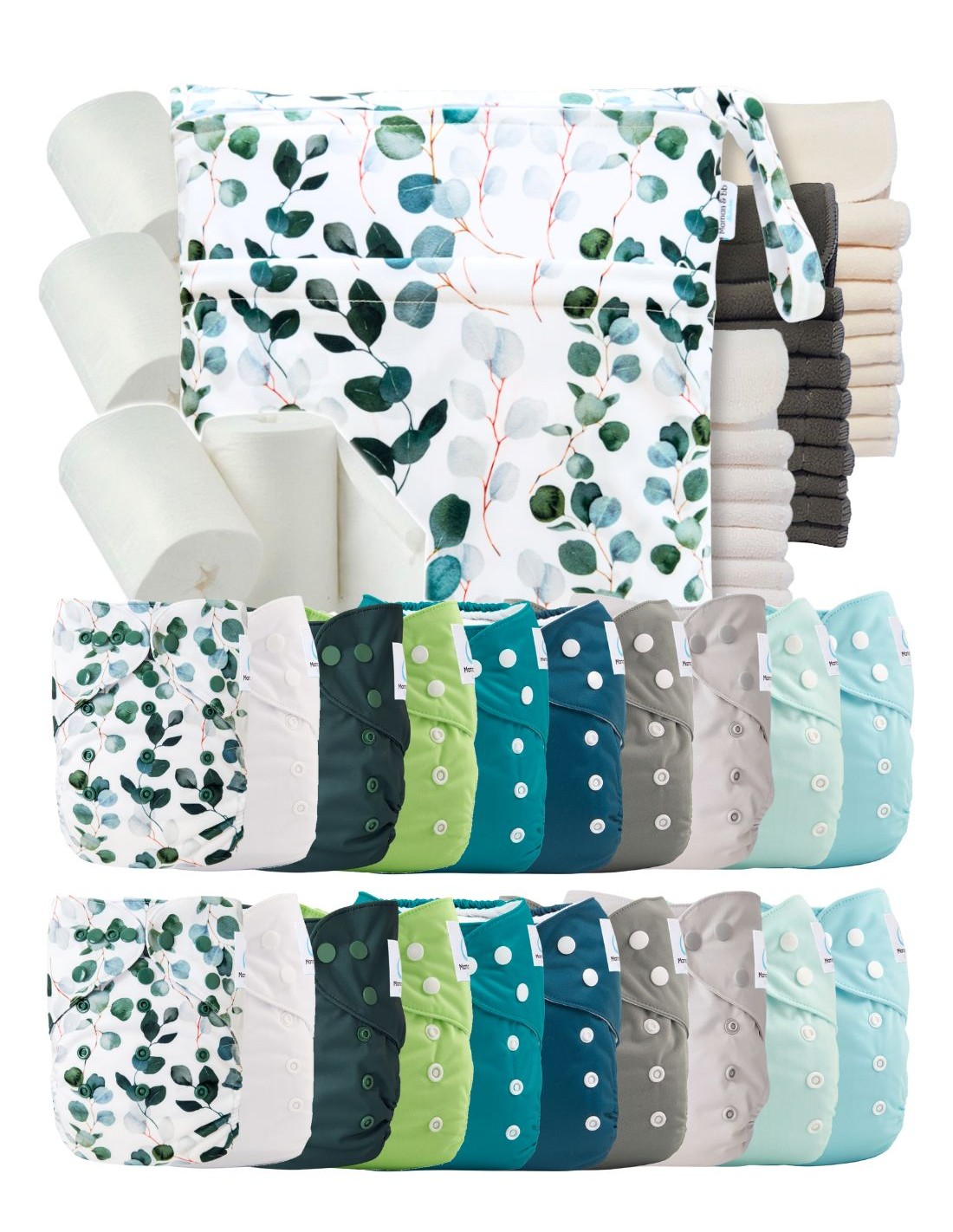 Mega Pack : lot de 20 couches lavables TE1 + 40 inserts + 400 voiles + sac - Eucalyptus