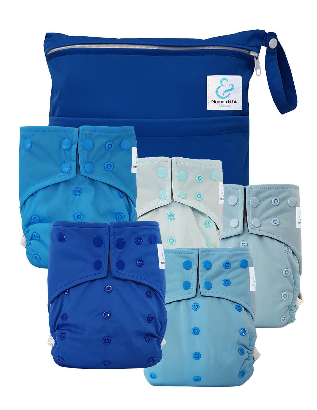 Optez pour la simplicité avec ce kit composé de 5 couches lavables intégrales TE1 à poche et de leur sac imperméable assorti — le duo idéal pour un change sain, partout et en toute sérénité 🌸