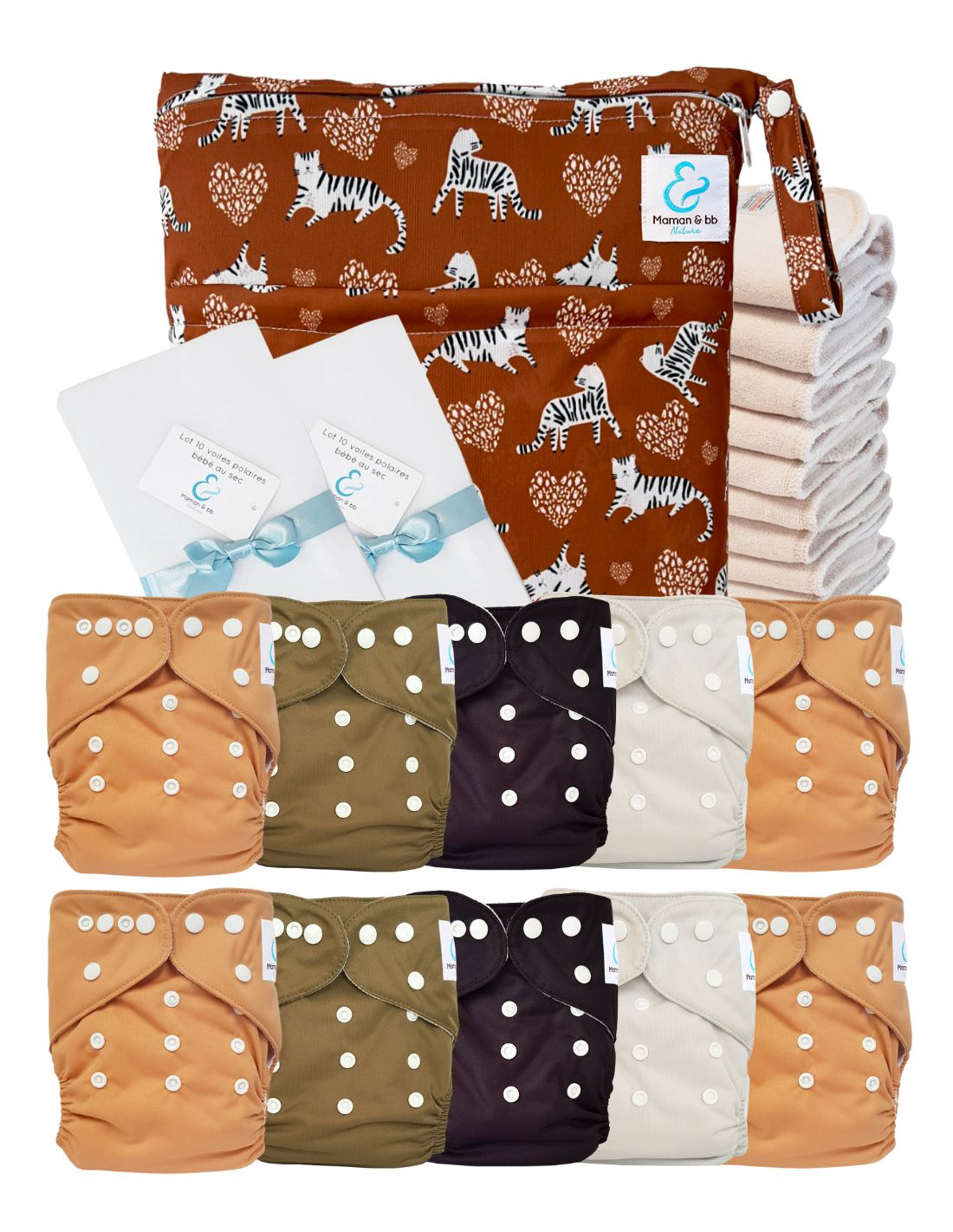 Pack Premium Sensitive : lot de 10 couches lavables TE1 + inserts en coton + voiles + sac imperméable - Titou