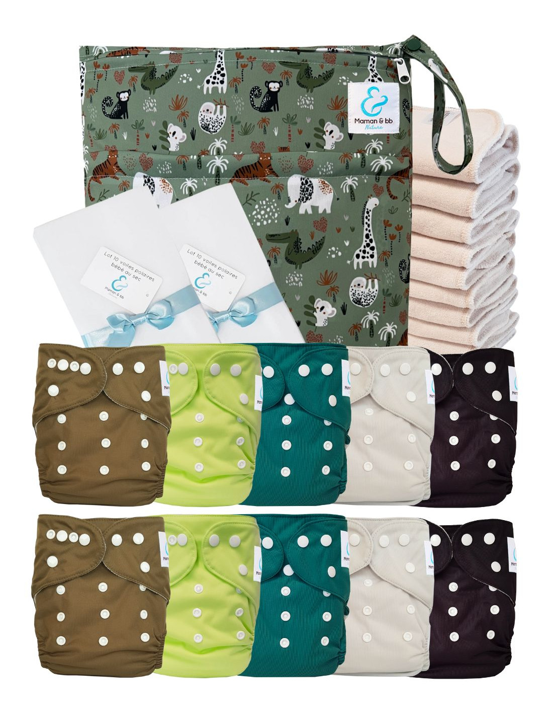Pack Premium Sensitive : lot de 10 couches lavables TE1 + inserts en coton + voiles + sac imperméable - Jungle