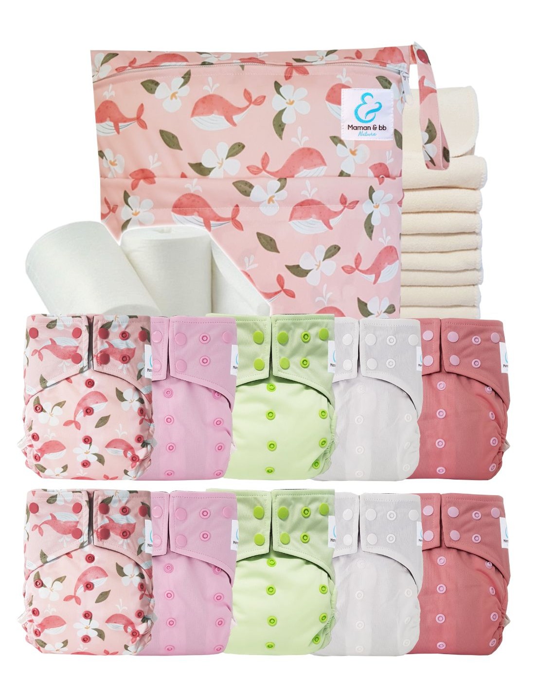 Pack complet 10 couches lavables intégrales + inserts bambou sac imperméable et voiles de protection