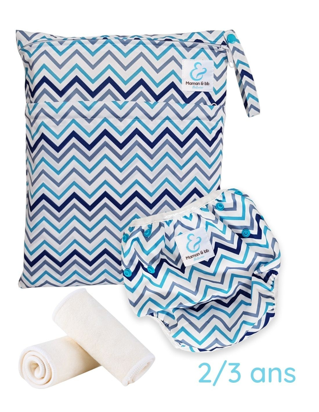 Kit Baignade bébé 2/3 ans - Couche maillot de bain lavable + sac imperméable + inserts - Chevron