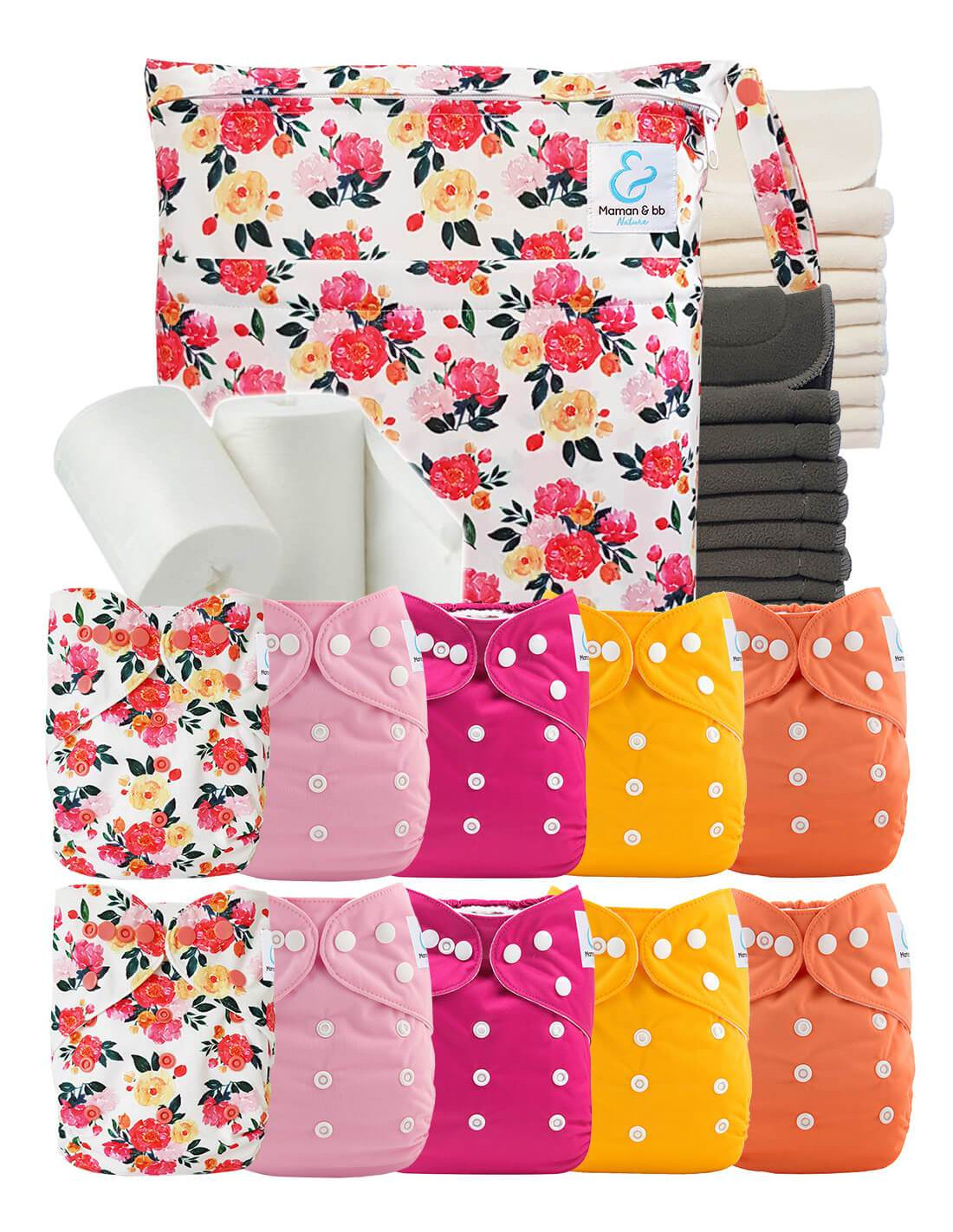 Pack premium Bambou TE1 : lot de 10 couches lavables + inserts bambou + voiles + sac imperméable - Peony