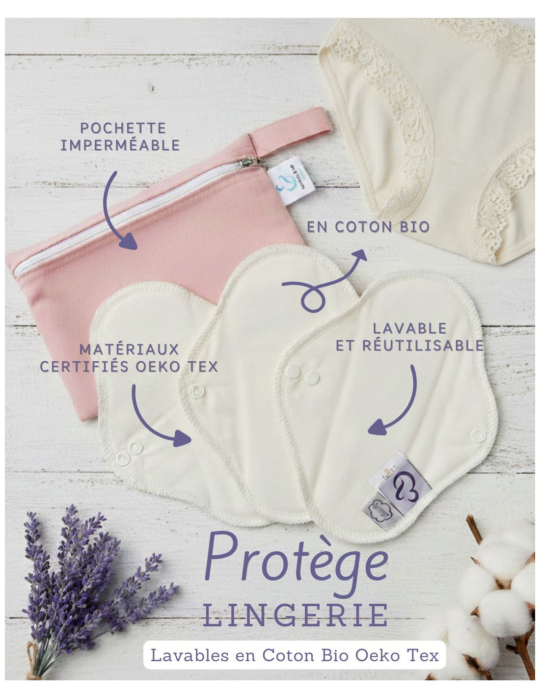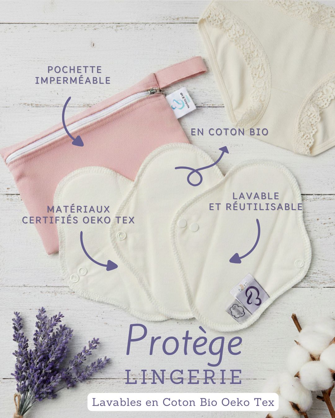 Ces protections hygiéniques lavables et leur pochette imperméable sont certifiées Oeko Tex standard 100 Classe 1.
