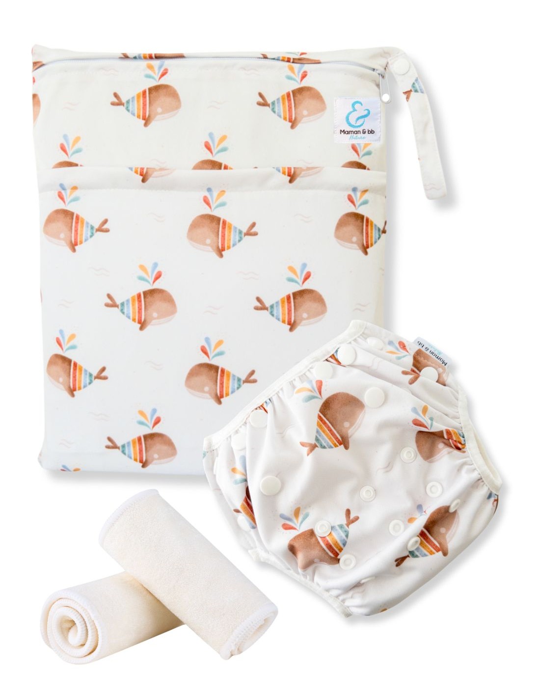 Kit Baignade bébé - Couche maillot de bain lavable + sac + inserts - Nolwene la baleine