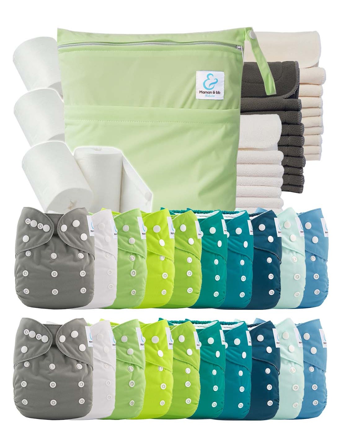 Mega Pack : lot de 20 couches lavables TE1 + 40 inserts + 400 voiles + sac imperméable - Green Leaf