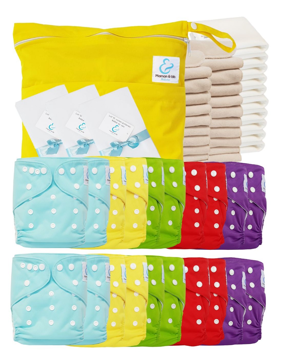 Mega pack 20 couches lavables TE1 + inserts + voiles de protection et son sac imperméable