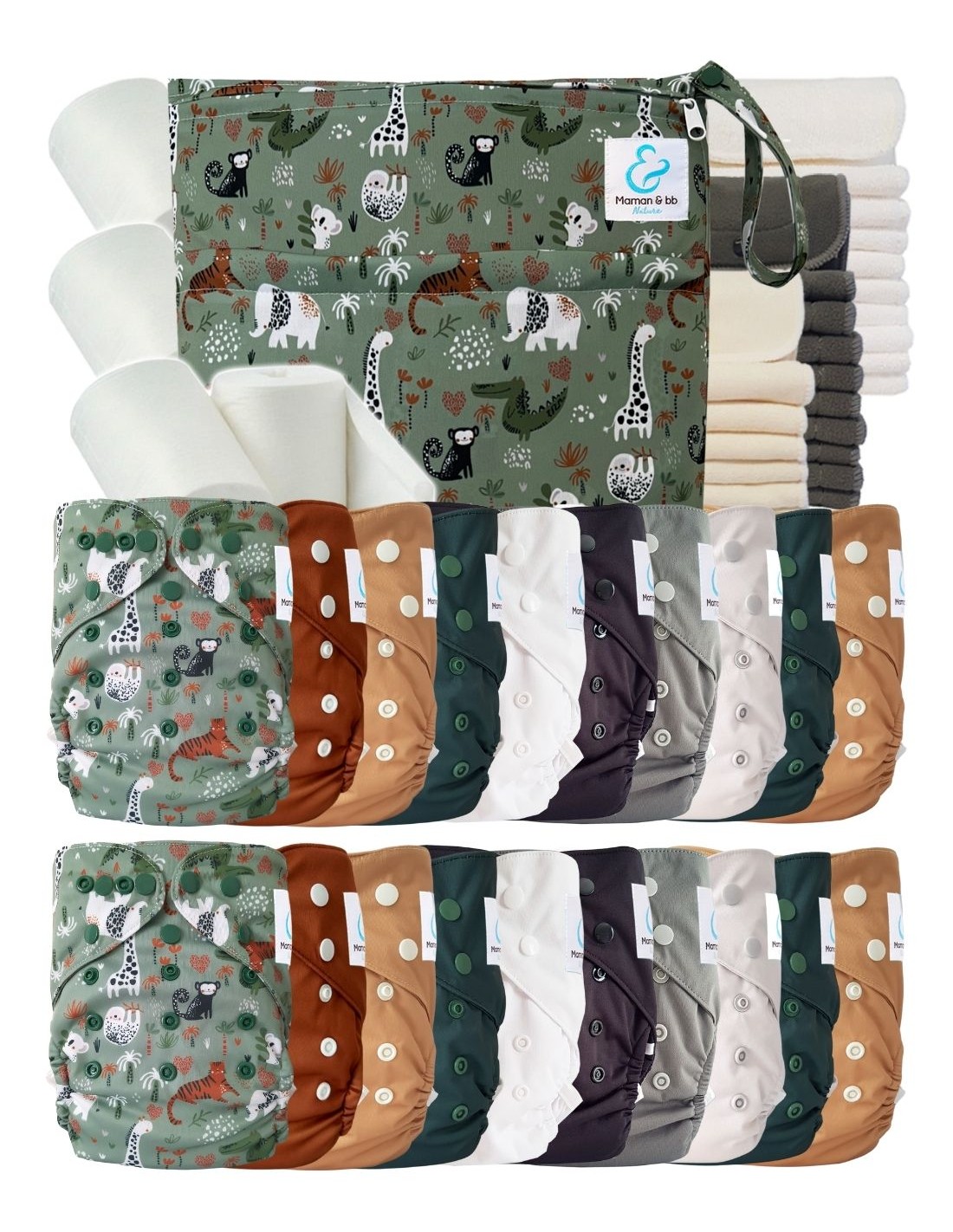 Mega pack : 20 couches lavables TE2 + 30 inserts + 400 voiles + sac - Jungle