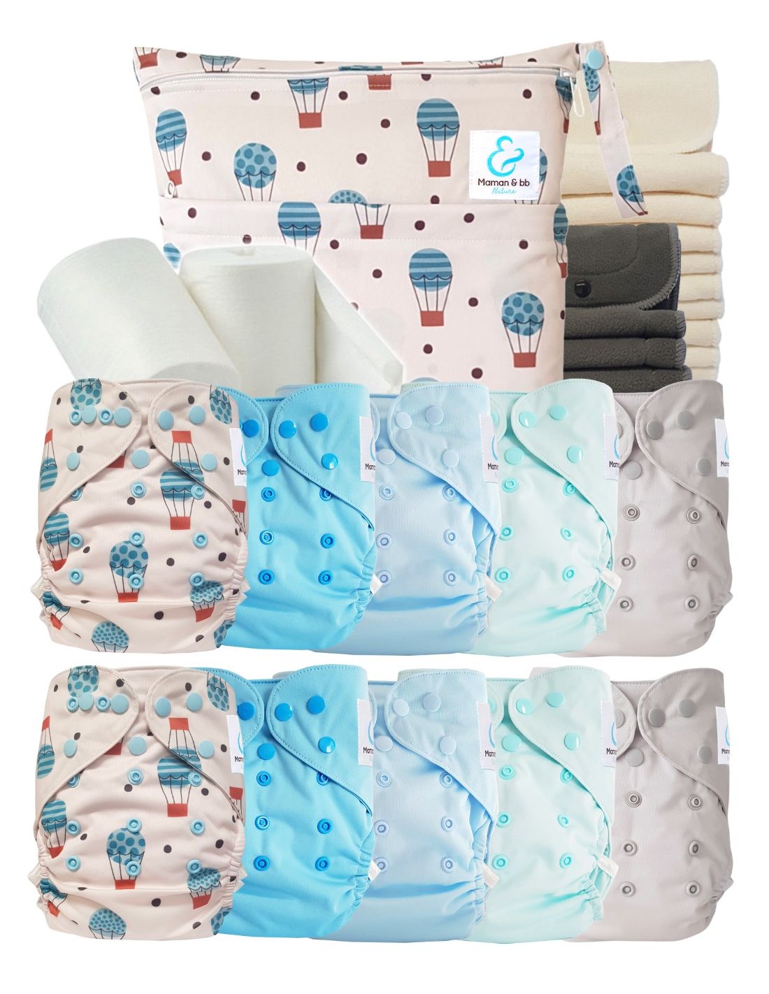 Pack complet couches lavables TE2 + 10 inserts bambou + 10 inserts charcoal + sac imperméable + voiles de protection