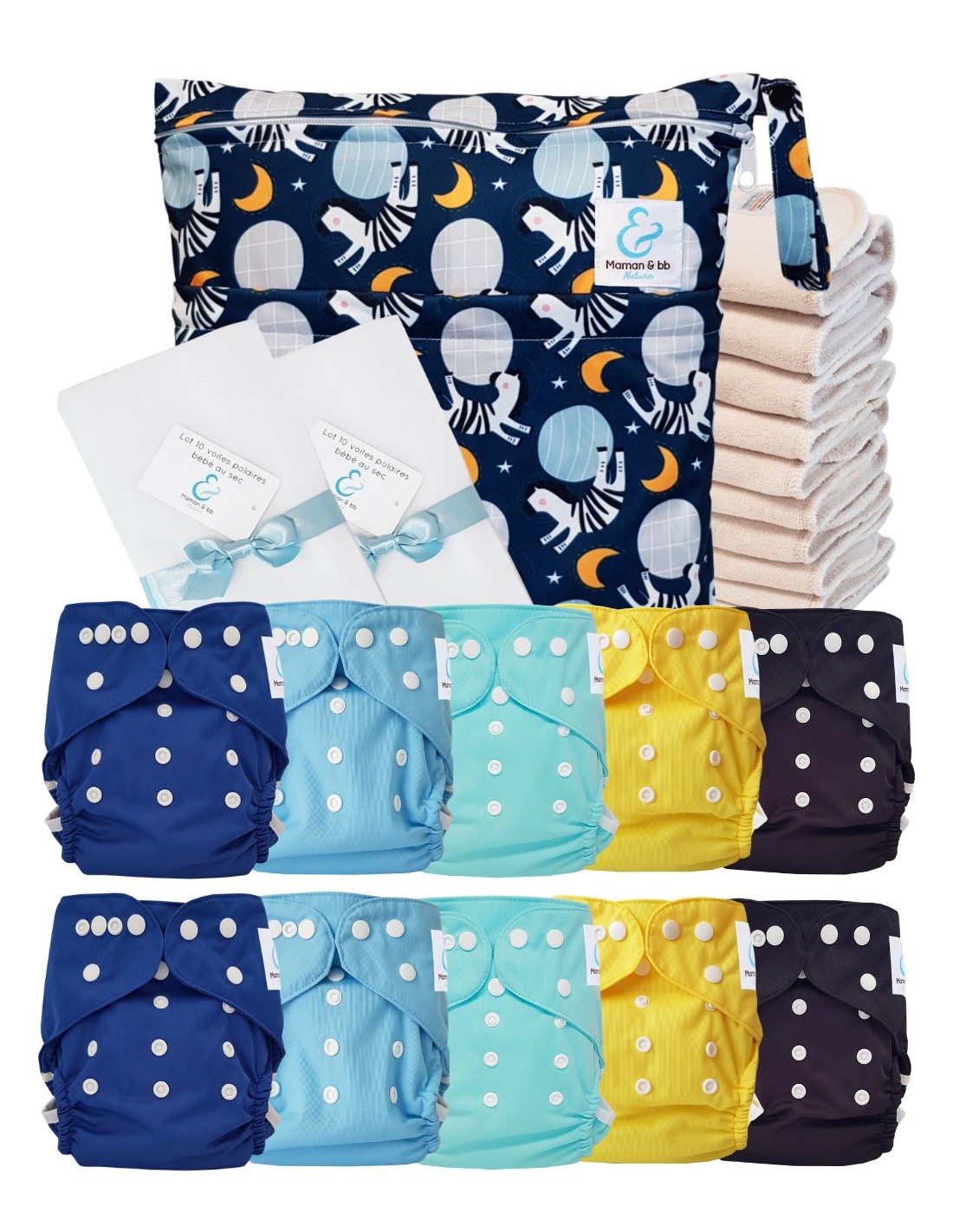 Pack Premium Sensitive : lot de 10 couches lavables TE2 + inserts en coton + voiles + sac - Caleb