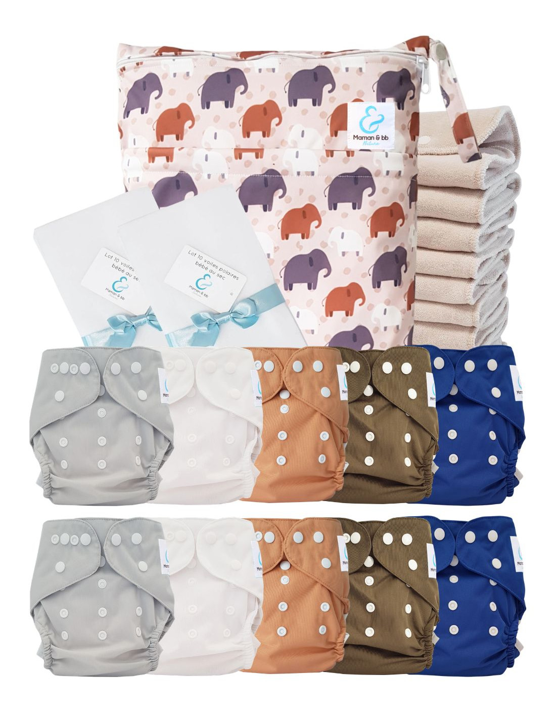 Pack Premium Sensitive : lot de 10 couches lavables TE2 + inserts en coton + voiles + sac imperméable - Douceur